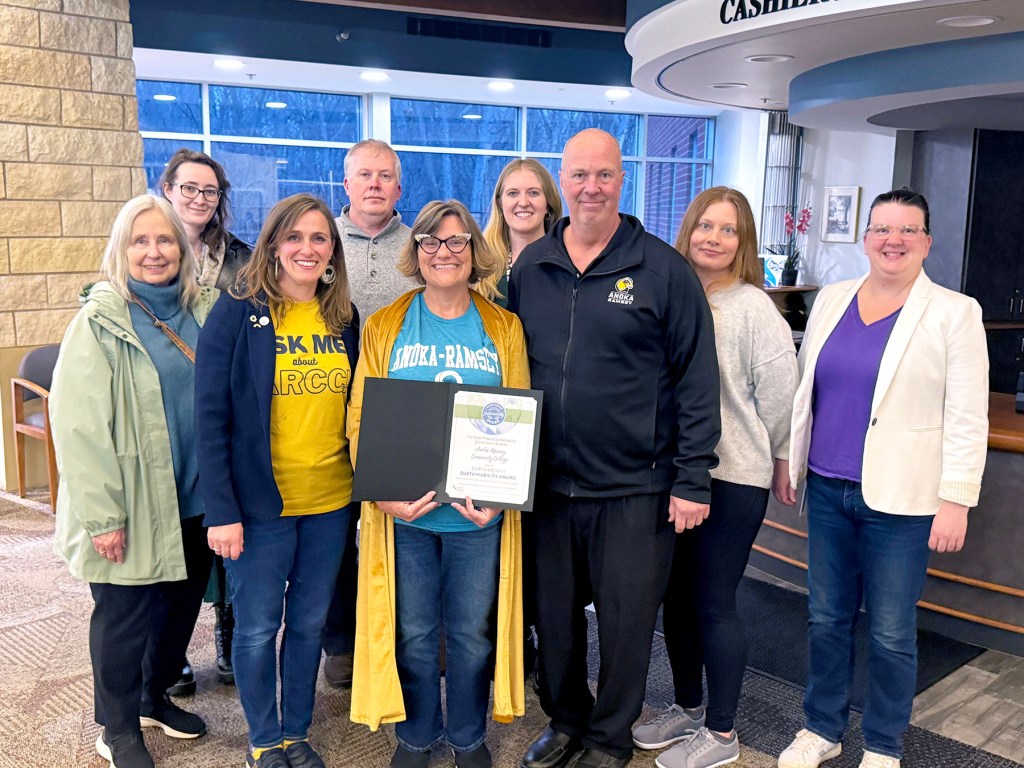 Anoka-Ramsey Community College was awarded a 2025 Earth Month Sustainability Award by the City of Coon Rapids Sustainability Commission for our new Bee Lawn and Solar Wall atop the Science Building. ARCC’s Victoria Downey (Geography), Lisa Becker (Anthropology) and President Kent Hanson accepted the award, pictured here with Sustainability Commission members and Olivia Dorow Hovland, Coon Rapids Sustainability Planner.