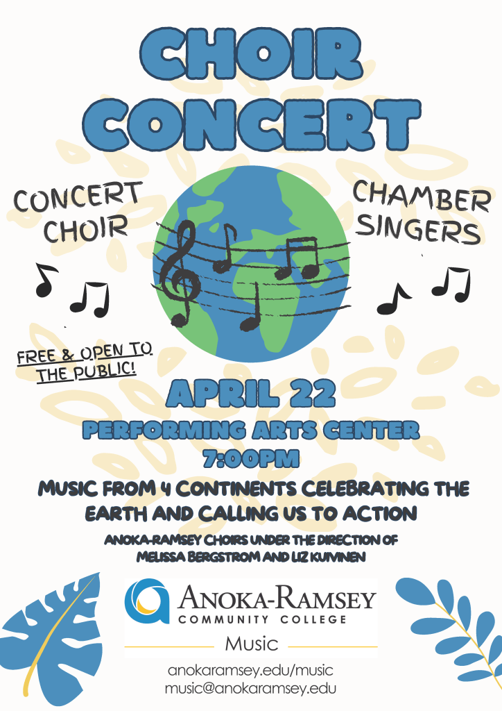 Join us for a concert by three college choirs: Cambridge Concert Choir, Rapids Concert Choir, and Chamber Singers, including Ticheli’s Earth Song, Grau’s Kasar Mie La Gaji (The Earth is Tired) and more