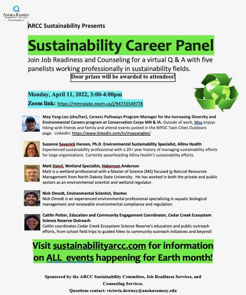 The Sustainability Committee hosted our first Student Sustainability Summit on Monday, November 18th. We had a number of organizations in attendance, including MN350 & Anoka County Climate Action, Metro Transit, the ARCC Sustainability Club, and PlugInConnect. We also had student presentations from Introduction to Business and Introduction to Sustainability classes (and of course free food)!