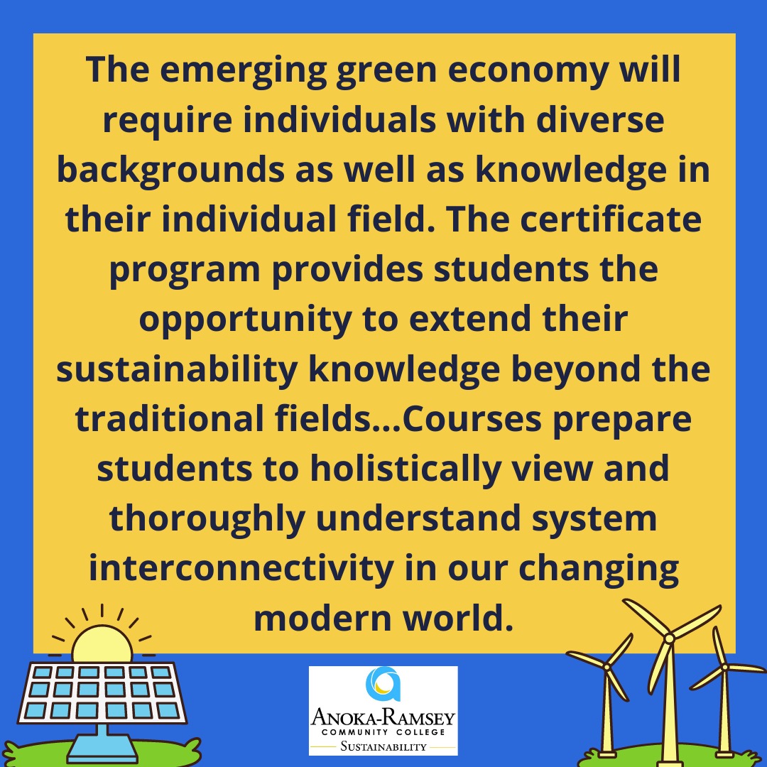 The 16-credit Sustainability Certificate program provides students with an understanding of the foundation of sustainability, as well as insights and tools for encouraging and strengthening environmental awareness and action in their personal lives and communities. The emerging green economy will require individuals with diverse backgrounds as well as knowledge in their individual field. The certificate program provides students the opportunity to extend their sustainability knowledge beyond the traditional fields. Students will be encouraged to choose courses from a range of disciplines including: environmental, economic, social/cultural, and wellness. Courses prepare students to holistically view and thoroughly understand system interconnectivity in our changing modern world.